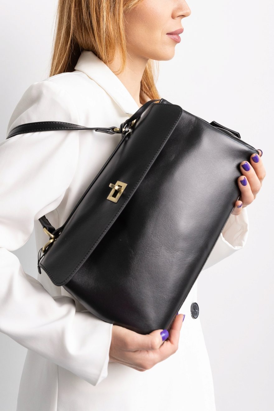 Изготовлена из качественной натуральной кожи чёрного цвета с благородным лакированным блеском. Фурнитура выполнена в винтажном стиле цвета «латунь», которая со временем может приобрести лёгкую патину, подчёркивая уникальность аксессуара. Два съёмных плечевых ремня в комплекте: удобный кожаный ремень для классического образа и лёгкий текстильный ремень в стиле casual для повседневной носки.