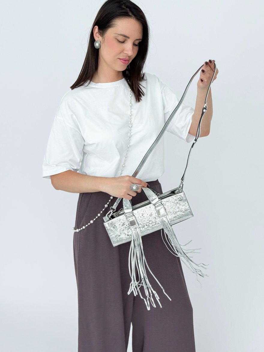 Поразите всех своим стилем! Ультрамодная сумка-багет из натуральной кожи в серебряном цвете — это настоящая находка для ярких и смелых женщин. Натуральная кожа с эффектной отделкой бахромой — тренд сезона! Металлический серебряный цвет и блеск кожи создают праздничный образ. Идеальный выбор для выпускного вечера, свадьбы, торжественного мероприятия или любого события, где вы хотите блистать. Превратит даже самый простой наряд в стильный лук. • Материал: натуральная кожа. • Цвет: серебряный. • Отделка: кожаная бахрома. • Размер: 30×10×7 см. • Ручка: 23 см. • Комплектация: длинный плечевой ремень.